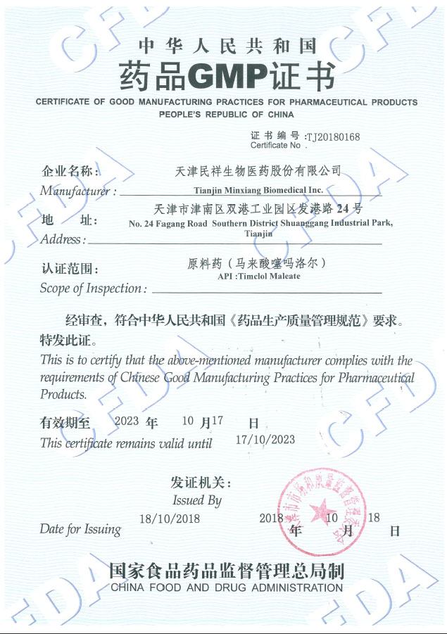 中華人民共和國(guó)藥品GMP證書(shū)(馬來(lái)酸噻嗎洛爾)