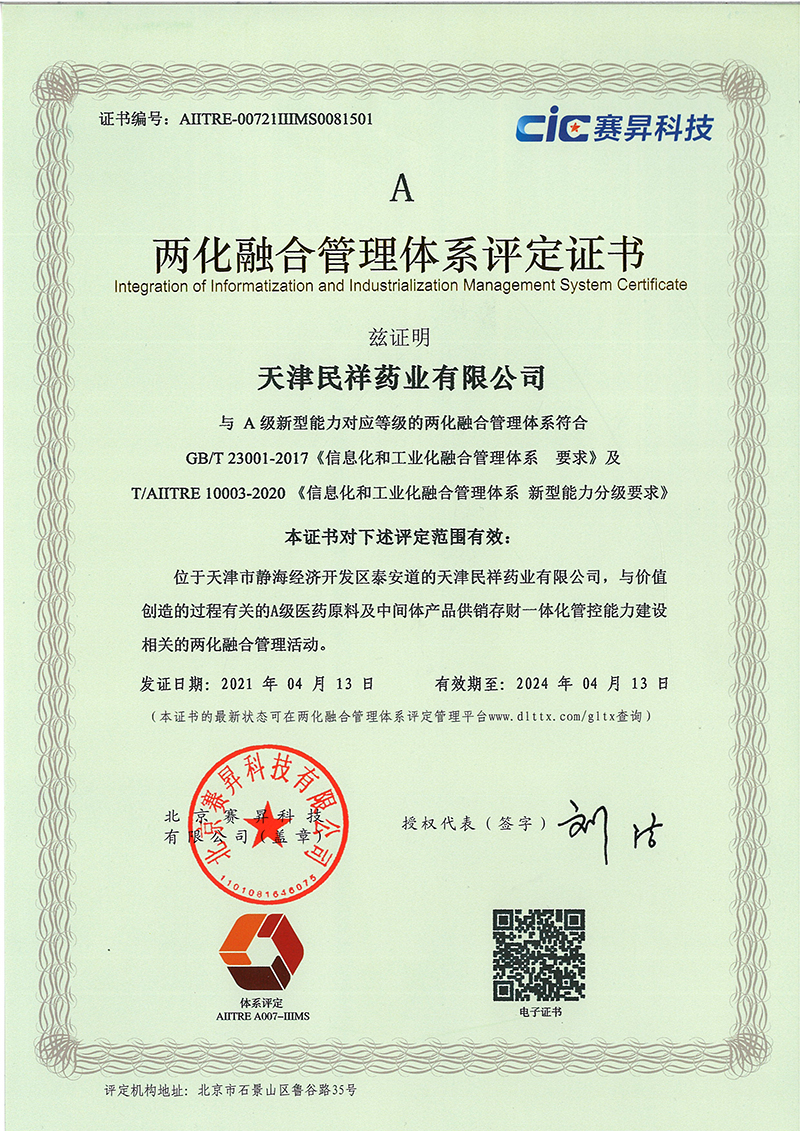 兩化融合管理體系評(píng)定證書(shū)--民祥藥業(yè)
